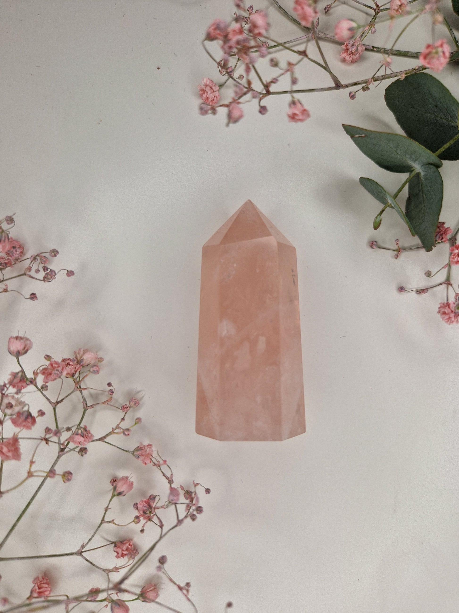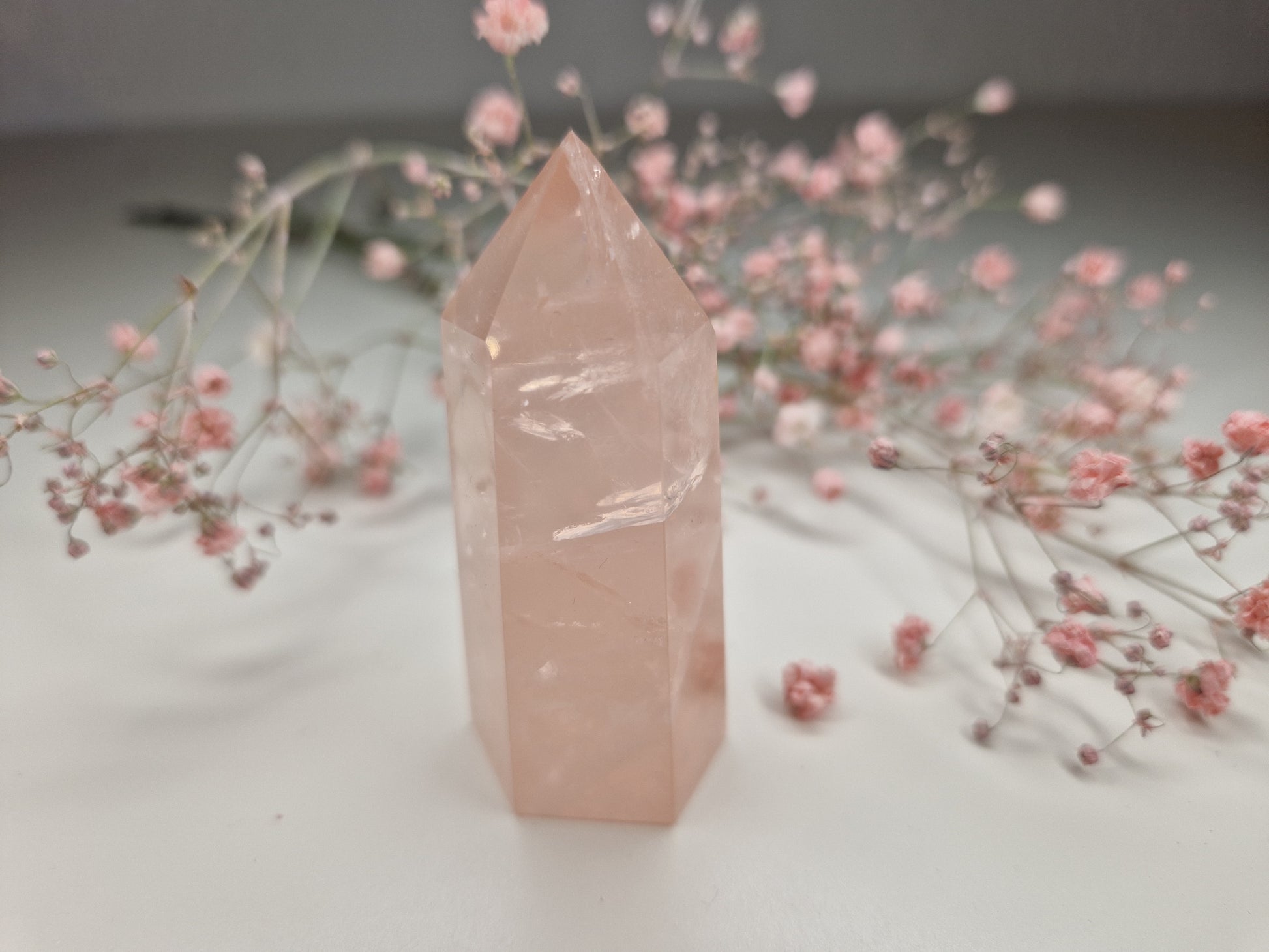 Dieser Rosenquarz Turm hat eine Höhe von ca. 7cm. Er hat leider durch den Transport eine minimale Beschädigung an der Spitze.